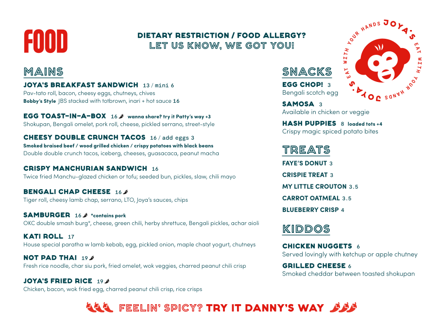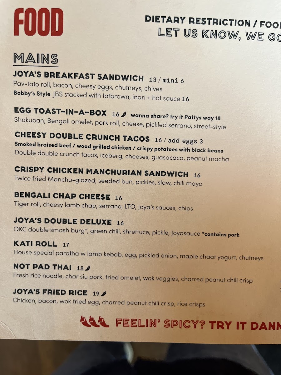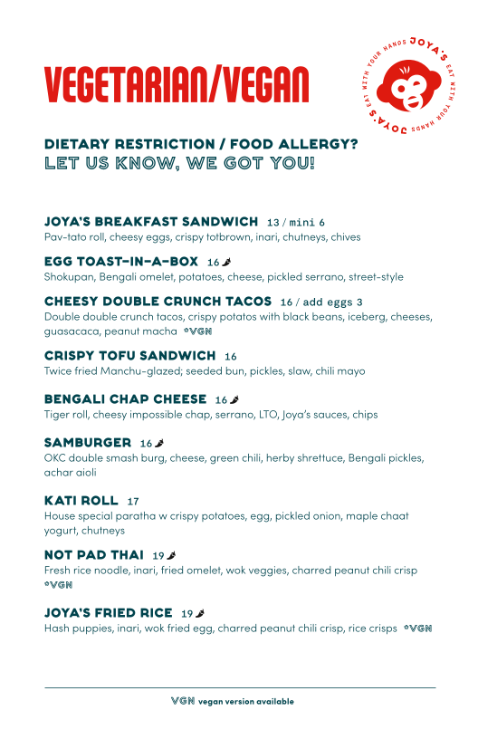 The breakfast selection features hearty sandwiches like the Joya’s Breakfast Sandwich and Bobby’s Breakfast Sandwich, perfect for starting your day with a satisfying mix of cheesy eggs, crispy tots, and flavorful chutneys. Lunch options bring in diverse influences with offerings such as the Vegetarian Kati Roll and Crispy Chicken Manchurian Sandwich—dishes that balance familiar textures with nuanced spices.